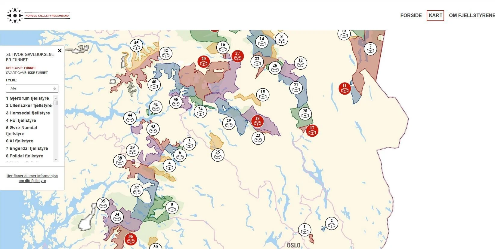 På kartet på www.fjellstyregavene.no kan du se hvilke bokser som er funnet og hvilke bokser som fremdeles ligger ute.